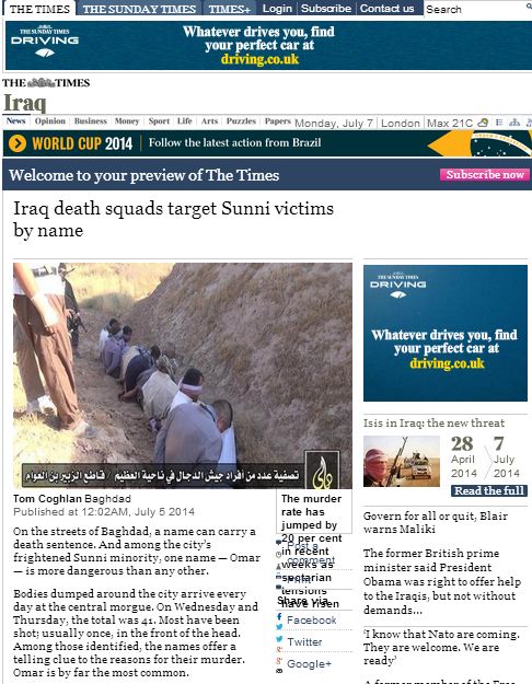 وأضاف مراسل الصحيفة البريطانية في بغداد، أن أكثر من تم إعدامهم في الشوارع كان اسمهم "عمر" وأنه في يومي الأربعاء والخميس الماضيين وصل إلى المشرحة المركزية في بغداد نحو 41 قتيلا معظمهم قتلوا برصاصة في الرأس كما تم مقتل 8 أشخاص يحملون اسم عمر الأسبوع الماضي في منطقتي الرصافة والكرخ..