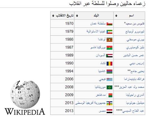صنفت موسوعة "ويكيبديا"، ماحدث في 3 يوليو على أنه انقلاب عسكري، وأن "عبدالفتاح السيسي"، وصل إلى الحكم عن طريق انقلاب عسكري .