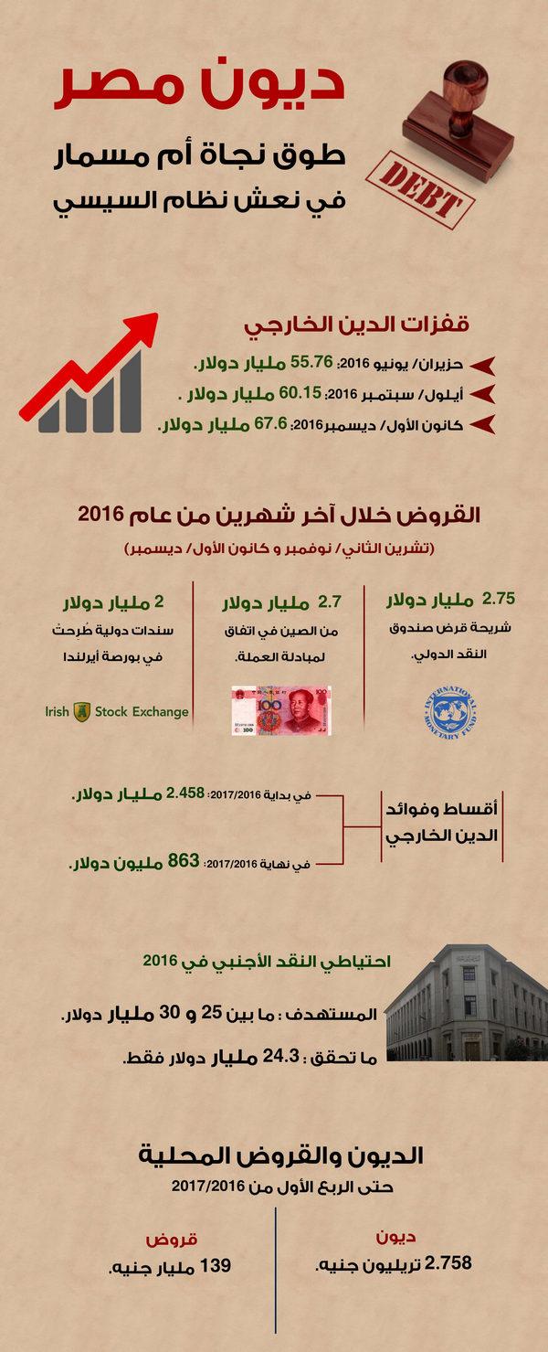 تدخل مصر عام 2017 عبر بحر من الديون، فللمرة الأولى في تاريخ البلاد يقفز الدين الخارجي إلى نحو 67.6 مليار دولار في نهاية ديسمبر 2016 مقارنة بـ 55.76 مليار دولار في يونيو 2016.