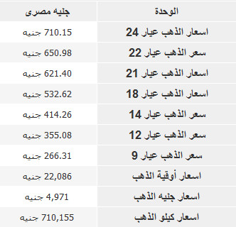 ووصلت أسعار الذهب في محلات الصاغة المصرية كما يلي: