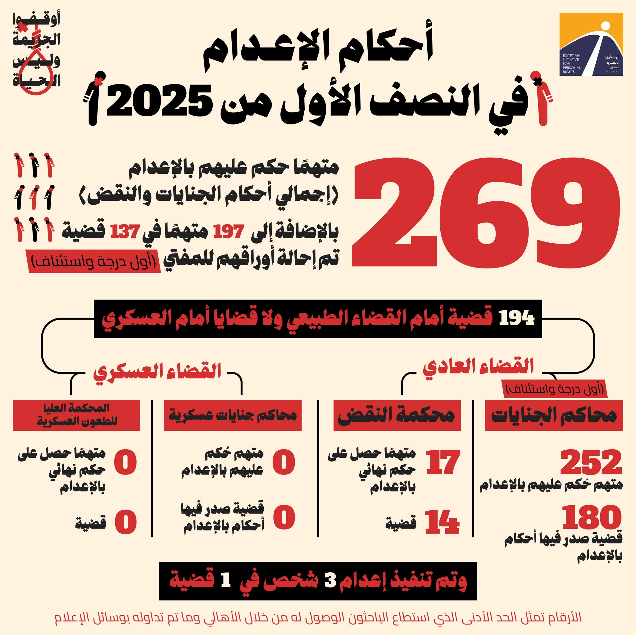 ووفقًا لبيانات حديثة صادرة عن المبادرة المصرية للحقوق الشخصية، فقد أصدرت المحاكم المصرية خلال الشهور الستة الأولى من العام الجاري أحكامًا بالإعدام ضد 269 شخصًا في 194 قضية متنوعة. وبلغ عدد الأحكام النهائية غير القابلة للطعن 17 حكمًا تمهيدًا لتنفيذها، بينما تم إحالة أوراق 197 متهمًا آخرين إلى مفتي الجمهورية في 137 قضية كإجراء تقليدي يسبق إصدار الأحكام.