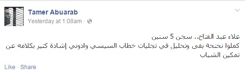 وكتب الكاتب الصحفي تامر أبوعرب: "علاء عبد الفتاح.. سجن 5 سنين، كملوا نحنحة بقى وتحليل في تجليات خطاب السيسي وادوني إشادة كتير بكلامه عن تمكين الشباب".