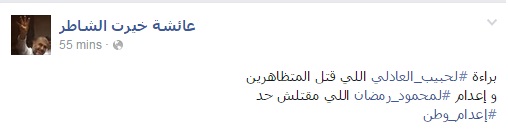 من جانبها، علقت عائشة خيرت الشاطر في تدوينة لها عبر صفحتها على موقع"فيس بوك": "براءة #لحبيب_العادلي اللي قتل المتظاهرين، وإعدام #لمحمود_رمضان اللي مقتلش حد #إعدام_وطن".