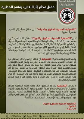 أدانت التنسيقية المصرية للحقوق والحريات مقتل المحامي "كريم محمد حمدي" 28 عاما، إثر تعرضه للتعذيب الشديد في قسم المطرية، مطالبةً بضرورة التحقيق في وقائع القتل تحت وطأة التعذيب بالسجون وأقسام الشرطة.