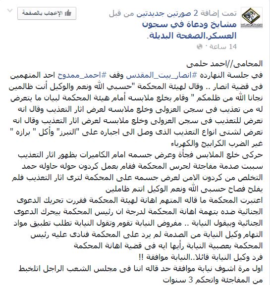 وأكد المحامي، أن أحمد ممدوح خلع ملابسه أمام هيئة المحكمة لبيان ما يتعرض له من تعذيب في سجن العزولي، وهو يصرخ ويقول "تعرضت لشتى أنواع التعذيب الذي وصل إلى إجباري على "التبرز" وأكل "برازي" غير الضرب بالكرابيج والكهرباء".