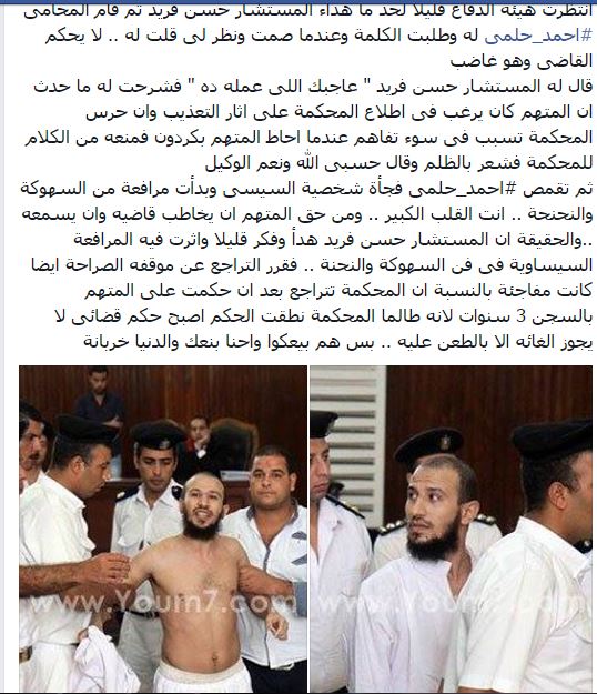 جاء ذلك في تصريحات للمحامي أحمد حلمي، محامي الشاب المتهم، وهي التصريحات التي تداولها عدد من رواد مواقع التواصل الاجتماعي ونشرتها بعض الصفحات كـصفحة "مشايخ ودعاة في سجون العسكر".