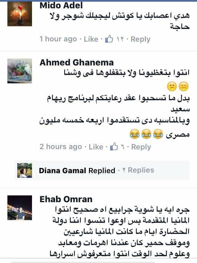 وقال أحمد غنيمة: "انتو بتغيظونا ولا بتقفلوها فى وشنا .بدل ما تسحبوا عقد رعايتكم لبرنامج ريهام سعيد وبالمناسبة دى تستقدموا اربعه خمسة مليون مصري".