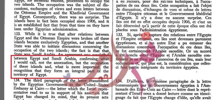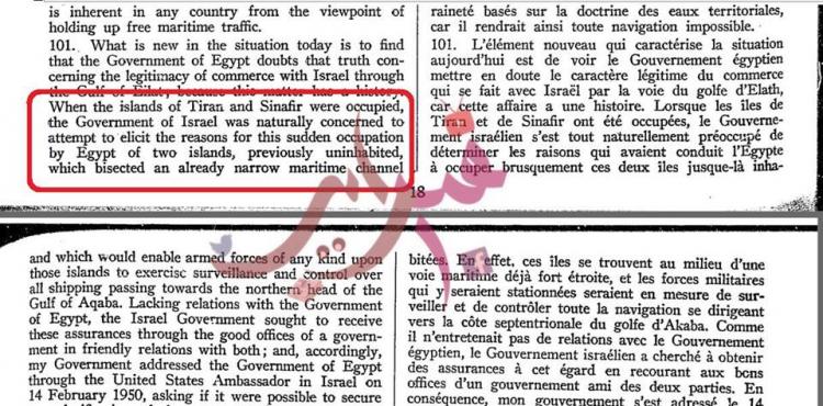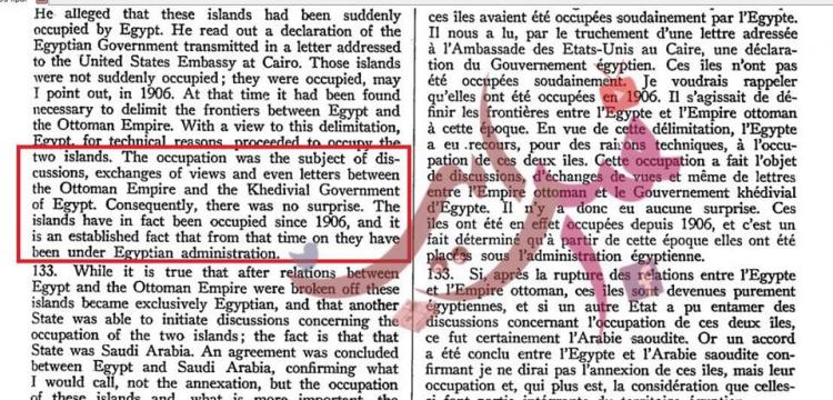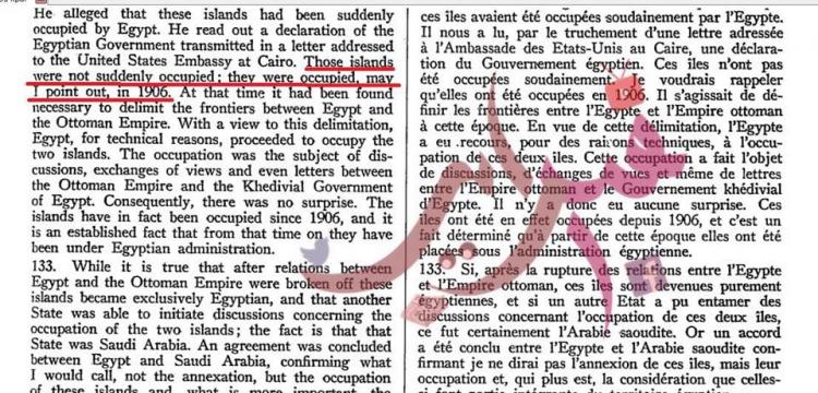 كما استند الشيخ إلى محضر لمجلس الأمن في فبراير 1954، والذي يقول فيه مندوب إسرائيل: "مصر سيطرت بشكل مفاجئ على الجزيرتين التي كانتا مهجورتين من قبل"، مشددًا على ما قاله المندوب الإسرائيلي الذي قال بأن الجزيرتين كانتا مهجورتين، ولم يقل بأنهما كانتا تحت السيطرة السعودية.