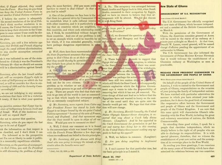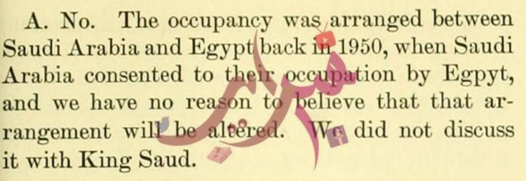 وثيقة رسمية من الخارجية الأمريكية: السفير الأمريكي يقول سنة 1957 إن بلاده لم تجد سببًا للاعتقاد بأن الاتفاق بين مصر والسعودية يمكن أن يتغير وبالتالي لم تتشاور مع السعودية بشأن السيطرة على الجزيرتين في أعقاب انسحاب إسرائيل بعد العدوان الثلاثي.