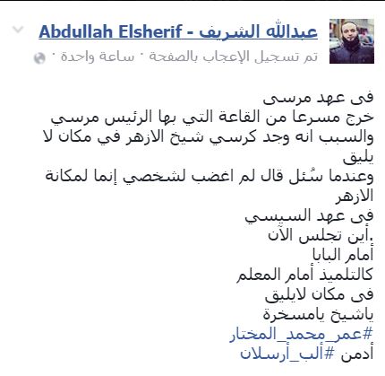 وقال -عبر منشور له على "فيس بوك"-: "في عهد مرسي، خرج مسرعًا من القاعة التي بها الرئيس مرسي والسبب أنه وجد كرسي شيخ الأزهر في مكان لا يليق، وعندما سُئل قال لم أغضب لشخصي إنما لمكانة الأزهر".