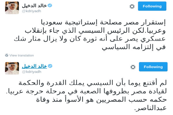 وقال في تغريدة عبر حسابه على موقع التدوين المصغر "تويتر": “استقرار مصر مصلحة استراتيجية سعوديًا وعربيًا، لكن الرئيس السيسي الذي جاء بانقلاب عسكري يصر على أنه ثورة كان ولا يزال مثار شك في التزامه السياسي".