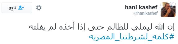 دشن رواد موقع التواصل الاجتماعي "تويتر"، هاشتاجًا تحت اسم "#كلمه_لشرطتنا_المصريه"، تعقيبًا على تجاوزات أفراد شرطة الانقلاب المتكررة تجاه المواطنين.