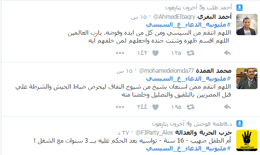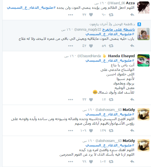 دشن رواد موقع التواصل الإجتماعي "تويتر"اليوم الأحد، هاشتاج بعنوان "مليونيه الدعاء ع السيسي" توجهوا خلاله بالدعاء على زعيم عصابة الانقلاب عبد الفتاح السيسي.