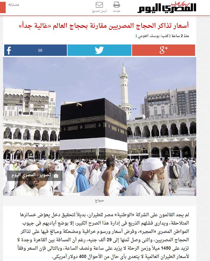 هاجمت صحيفة المصري اليوم الداعمة للانقلاب العسكري، ارتفاع أسعار الحج هذا العام بالمقارنة مع الأعوام السابقة، بسبب قرار الانقلاب بتعويم الجنية وارتفاع سعر الدولار والريال السعودي، وهو ما يؤكد زيف الوعود التي نسجها قائد الانقلاب العسكري عبد الفتاح السيسي عن انقشاع الأزمة الاقتصادية خلال أشهر قليلة.