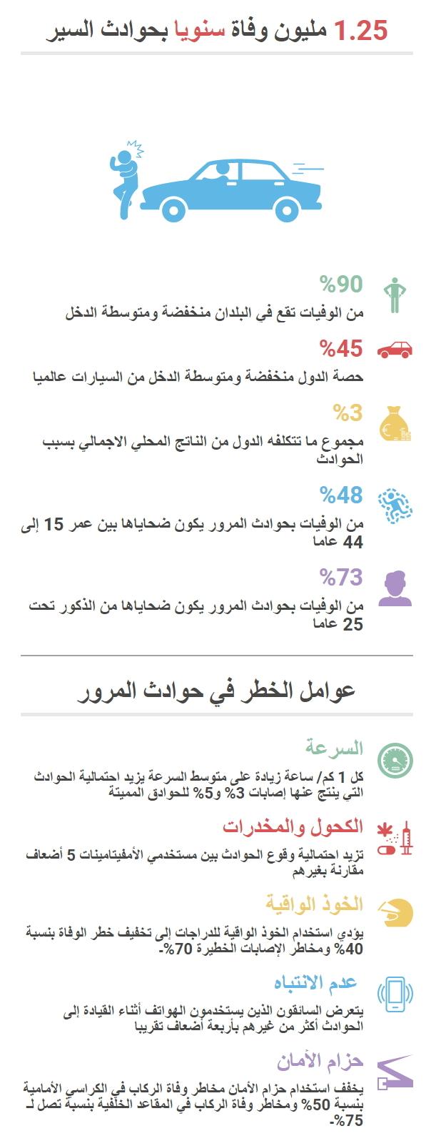 يفقد ما يقارب 1.25 مليون شخص حول العالم أرواحهم سنويا بسبب حوادث المرور فيما يتعرض ما يقرب من 50 مليون آخرين لإصابات غير مميتة.