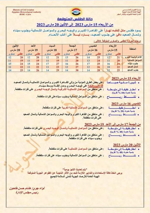 كما يتوقع أن يشهد غدا فرص أمطار خفيفة إلى متوسطة على مناطق من شمال الوجه البحرى على فترات متقطعة، وأمطار خفيفة إلى متوسطة على مناطق من السواحل الشمالية الشرقية على فترات متقطعة .