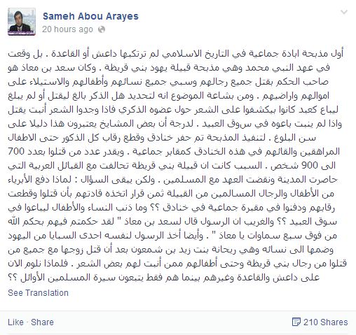 وقال "أبو عرايس": "أول مذبحة إبادة جماعية في التاريخ الإسلامي لم ترتكبها داعش أو القاعدة، بل وقعت في عهد النبي محمد وهي مذبحة قبيلة يهود بني قريظة، كان سعد بن معاذ هو صاحب الحكم بقتل جميع رجالهم وسبي جميع نسائهم وأطفالهم والاستيلاء على أموالهم وأراضيهم".