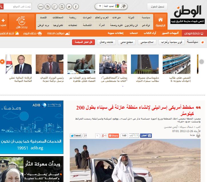 "مخطط أمريكى "إسرائيلي" لإنشاء منطقة عازلة فى سيناء بطول 200 كيلومتر"؛ كان هذا مانشيت الصفحة الرئيسة لجريدة الوطن 26 - 12 -2012 في عهد الرئيس محمد مرسي، حيث تصدرت عناوين الخطة الأمريكية كافة الصحف في ذلك الوقت لتشويه حكم الرئيس مرسي الذي نفى تلك الأنباء جملة وتفصيلاً .