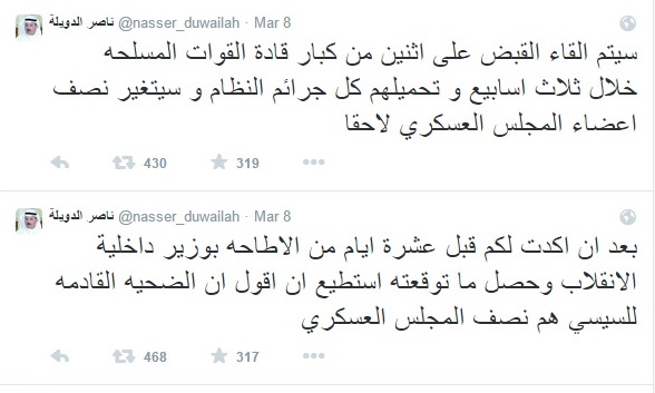 وقال "الدويلة" في تغريدة له على موقع التدوينات القصيرة "تويتر"، إنه "بعد أن أكدت لكم قبل عشرة أيام من الإطاحة بوزير داخلية الانقلاب، وحصل ما توقعته، أستطيع أن أقول إن الضحية القادمة للسيسي؛ هم نصف المجلس العسكري".