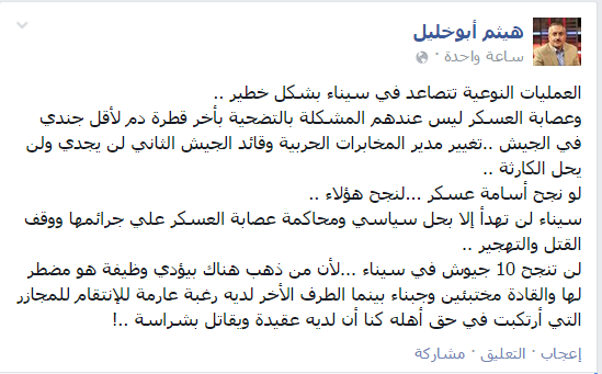 وأشار- عبر تدوينة له على موقع التواصل الاجتماعي "فيس بوك"- إلى أن العمليات النوعية ضد قوات الجيش والشرطة تتصاعد في سيناء بشكل خطير، مضيفا أن سيناء لن تهدأ إلا بحل سياسي ومحاكمة عصابة العسكر علي جرائمها ووقف القتل والتهجير .