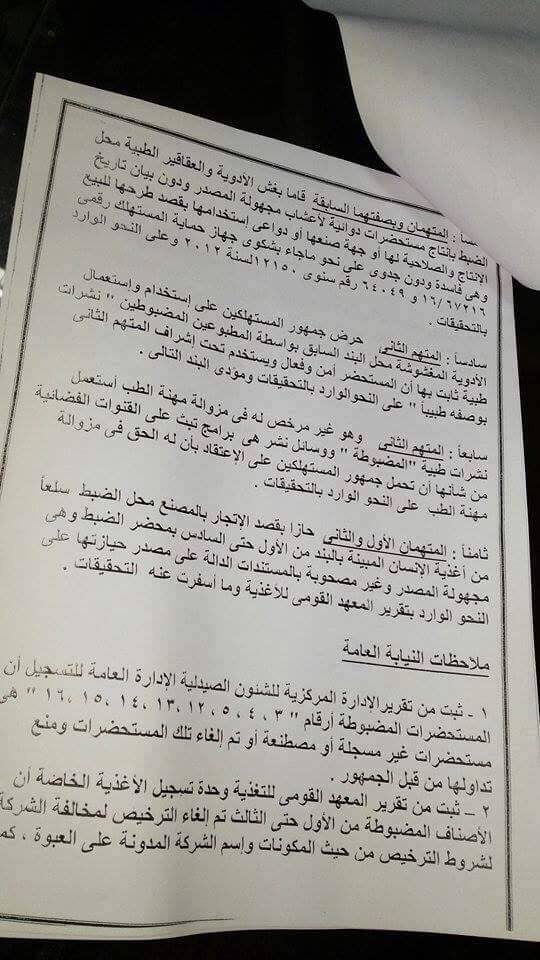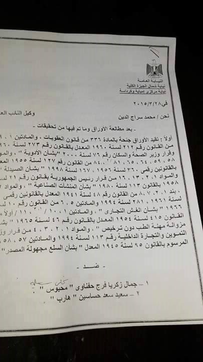 وبالاستناد للمادة 336 من قانون العقوبات، والمادتين 901، و902 من القانون المعدل رقم 273 لسنة 1960م، وقرار وزير الصحة رقم 76 لسنة 2000 بشأن الأدوية، بالإضافة إلى قرار جمهوري بشأن المنشآت الصناعية، وقانون الغش التجاري، وقانون السلع مجهولة المصدر؛ يُتهم كلٌّ من جمال زكريا فرج حفناوي، سعيد سعد حسانين، بإنتاج مستحضرات طبية لأعشاب مجهولة المصدر وهي فاسدة ودون جدوى، بحسب بلاغ جهاز حماية المستهلك.