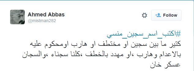 وقال Abdullah Elshamy على حسابه بتويتر "معتقلو فض رابعة، معتقلو النهضة، معتقلو أحداث السفارة الأميركية، معتقلو المنصة، معتقلو الأزهر معتقلو مصر.. اكتب اسم سجين منسي".